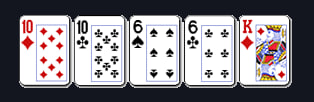 Two pair: Dua kartu dengan peringkat yang sama, dua kartu lain dengan peringkat sama yang lain, dan satu kartu tambahan.