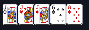 Three of a kind: Tiga kartu dengan peringkat sama dan dua kartu tambahan yang tidak berkaitan.