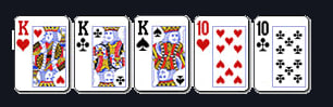 Full House: Tiga kartu dengan peringkat sama dan dua kartu dengan peringkat sama yang lain.