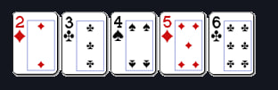 Catatan: As dapat digunakan pada urutan atas atau bawah dan satu-satunya kartu yang dapat digunakan seperti itu. A,K,Q,J,T adalah straight (Ace high) tertinggi; 5,4,3,2,A adalah straight (Five high) terendah.